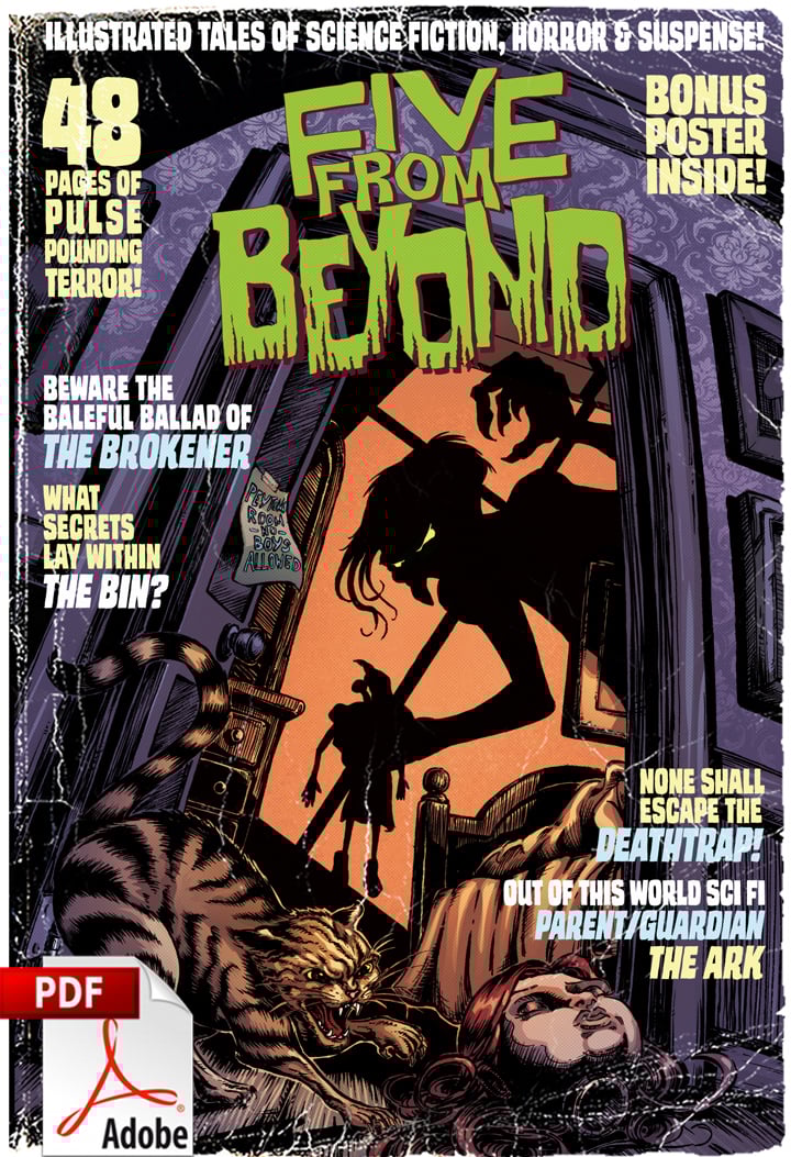 Drawing inspiration from classic anthology comics and television shows like Creepy, The Twilight Zone and Tales From the Crypt - FIVE FROM BEYOND is a full color, 48 page anthology comic featuring five short stories infusing elements of horror, suspense and science fiction into each gorgeously illustrated tale.